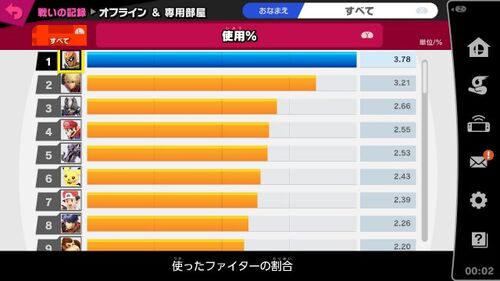 雑談です。現時点での使用率上位と下位について語ります! ちなみにオフライン専用部屋限定です。 ランダムマッチはDXのキャラまで触ってて飽きました……… トップ9です。対人戦よりCPUと戯れていて使用率が高いだけで実際に対人戦での使用率はそれほど…